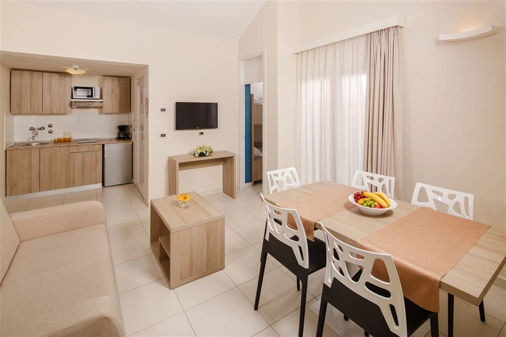 – 1 ložnice se dvěma lůžky, telefon, obývací pokoj, rozkládací pohovka pro 2 osoby, telefon, klimatizace, SAT/TV, trezor, Wi-Fi připojení, vlastní sociální zařízení (koupelna/WC), fén na vlasy, vybavený kuchyňský kout, mikrovlnná trouba, lednička, balkon nebo terasa. Dětská postýlka na vyžádání.