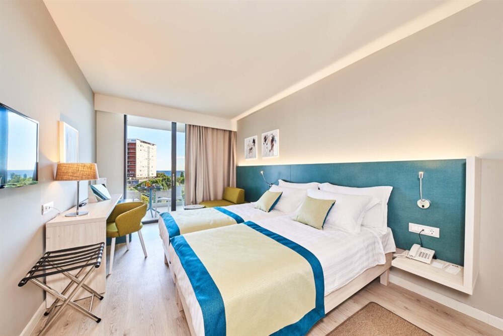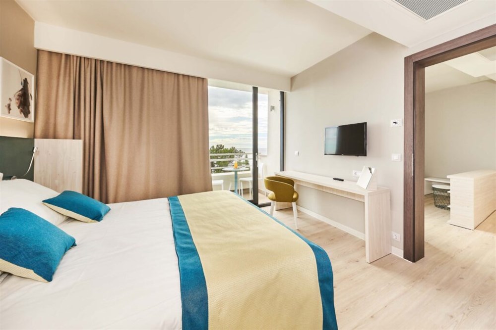 Pokoj Premium s výhledem na moře (PREMIUM BLC / SEA VIEW) – King size postel nebo 2 oddělená lůžka, vlastní sociální zařízení (koupelna/WC/fén), sat,TV, telefon, klimatizace, minibar, trezor, Wi-Fi připojení, balkon. Možnost jedné přistýlky. Výhled na moře. Dětská postýlka na vyžádání.