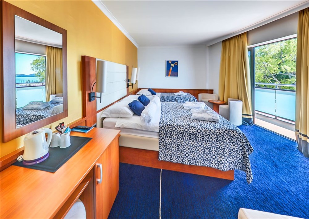 PREMIUM CLUB DBL – dvoulůžkový pokoj dvoulůžkový pokoj pokoj s výhledem na moře s VIP servisem. Manželská postel nebo 2 oddělená lůžka, vlastní sociální zařízení (koupelna se sprchou/WC/fén), klimatizace, topení, SAT/TV + rádio, trezor, minibar, telefon, Wi-Fi připojení zdarma a balkon. Možnost jedné přistýlky (75×200 cm).