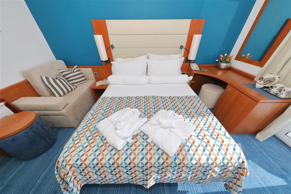 SUPERIOR DBL – dvoulůžkový pokoj s manželskou postelí nebo 2 oddělená lůžka s výhledem na moře, ostatní vybavení stejné jako u pokoje DBL COMFORT. Možnost jedné přistýlky (75×200 cm) a balkon.