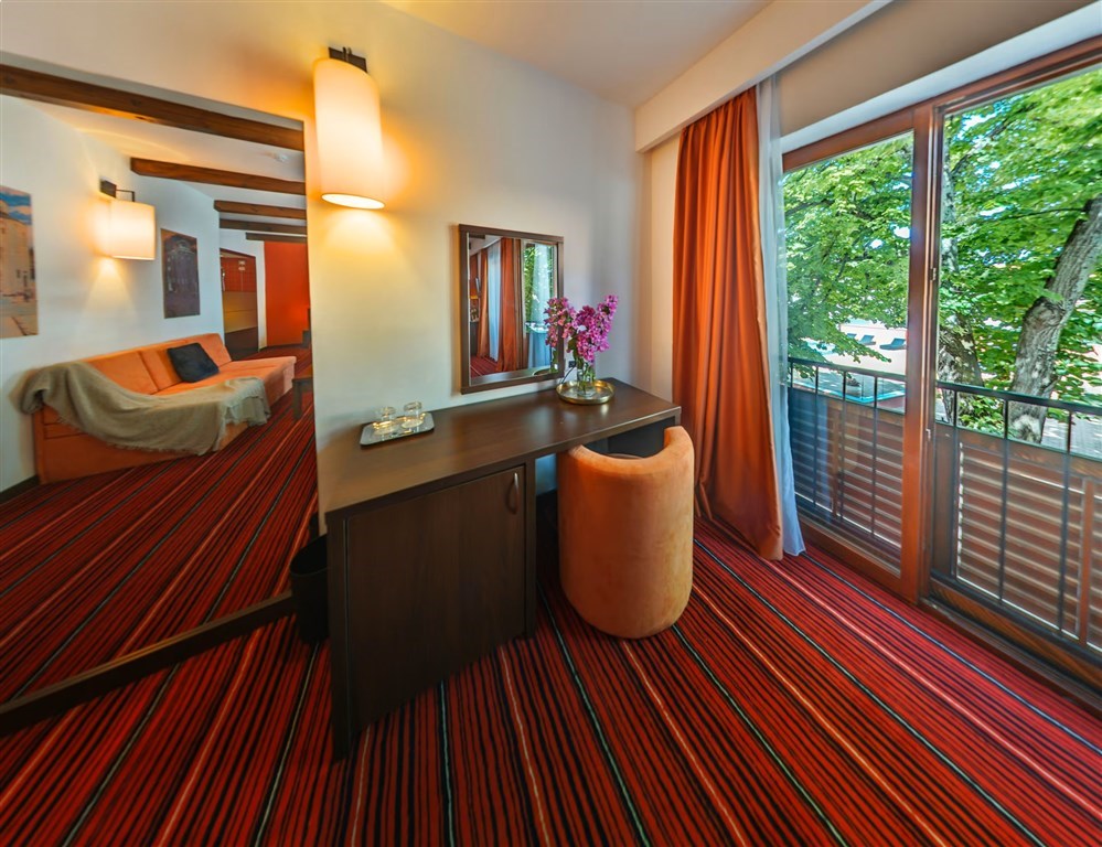 DBL SUPERIOR – dvoulůžkový pokoj kategorie 4* v historické budově hotelu Villa Donat, manželská postel, francouzské okno, možností jedné přistýlky o rozměrech 80×190 cm, vlastní sociální zařízení (koupelna s vanou/WC/fén), klimatizace, topení, SAT/TV, trezor, minibar, telefon s přímou volbou, Wi-Fi připojení zdarma.