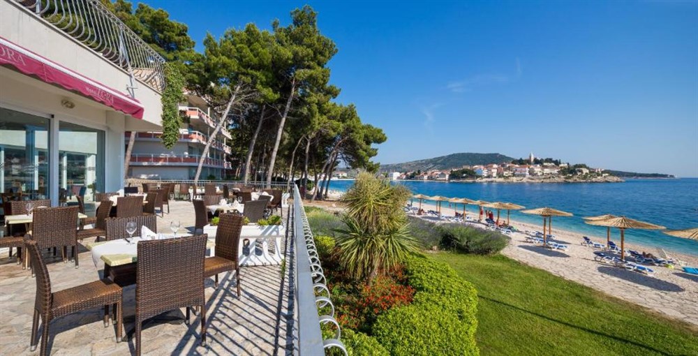 Hotel Zora se nachází na špičce poloostrova, přímo u moře, a je obklopen oblázkovými plážemi a borovicovým lesem, kterým vede přibližně 800 metrů dlouhá příjezdová cesta. Od historického centra Primoštenu je vzdálený jen asi 500 metrů. Ubytování je situováno v bezprostřední blízkosti moře, přibližně 50 m od pláže. Hosté si mohou vybrat mezi pokoji ve 3 a 4 kategorii**. Součástí areálu jsou restaurace, plážový bar, tenisové kurty, minigolf a další sportovní zařízení, což dělá z hotelu vhodnou volbu pro rodinnou dovolenou, aktivní pobyt i služební cestu.