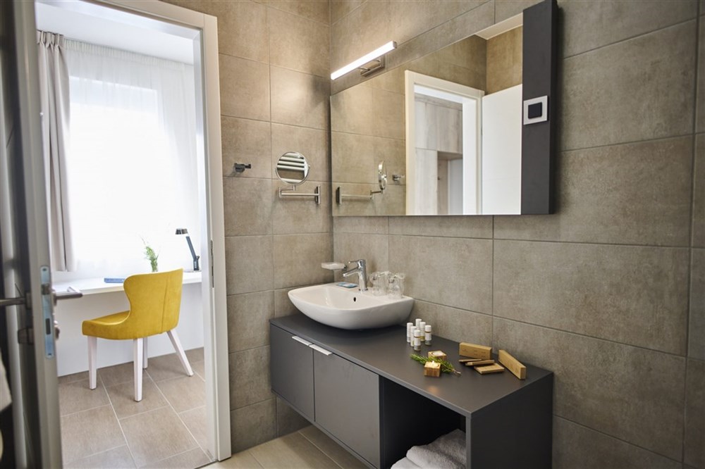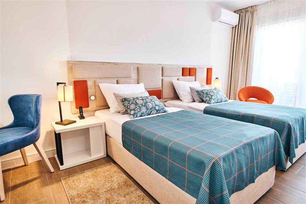 Dvoulůžkový pokoj – manželská postel, rozkládací pohovka, vlastní sociální zařízení (koupelna/WC/toaletní potřeby/fén, župan, pantofle), Wi-Fi připojení, klimatizace, trezor, telefon, SAT/TV, kuchyňka, lednice, mikrovlnná trouba, rychlovarná konvice, balkon s posezením.