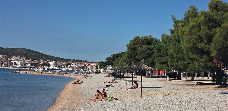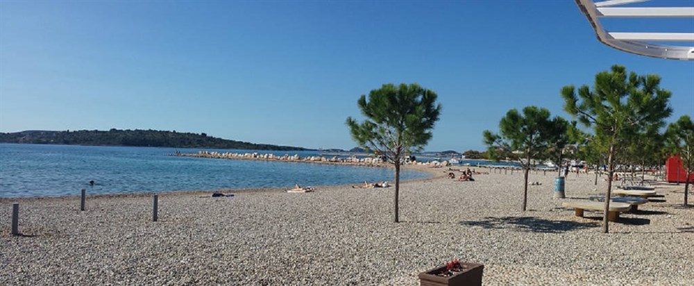 Vzdálenost cca 300 metrů. Oblázková pláž vhodná pro děti. Za poplatek jsou k dispozici vodní sporty - šlapadkla, loďky, skútry.