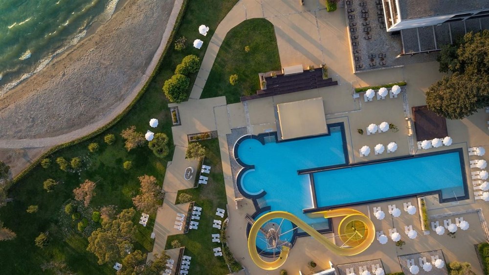 Vzdálená cca 100 m od hotelu, oblázkovo-písčitá pláž, travnaté plochy.