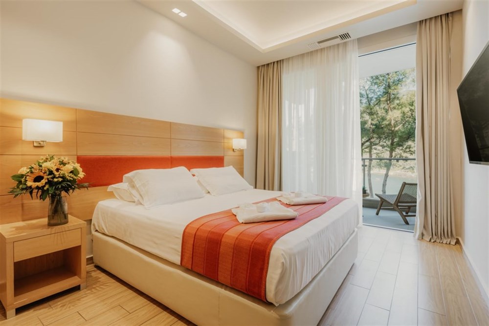 Pokoj s manželskou postelí nebo oddělenými lůžky, vlastní sociální zařízení (sprcha/WC/fén), SAT/TV, telefon, Wi‑Fi, mini lednička, klimatizace a balkon nebo terasa s výhledem na zátoku.
