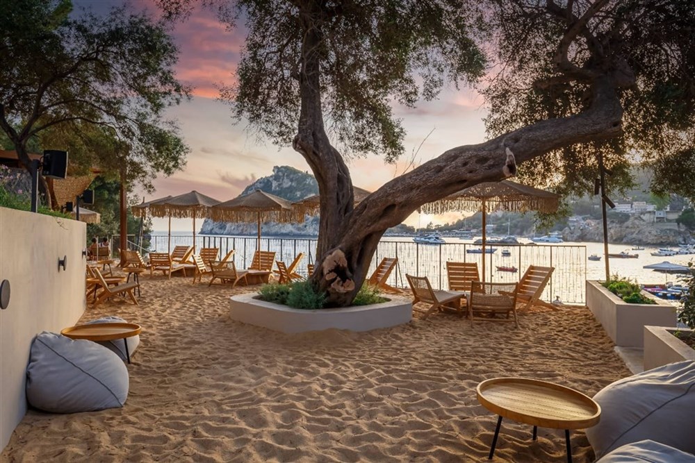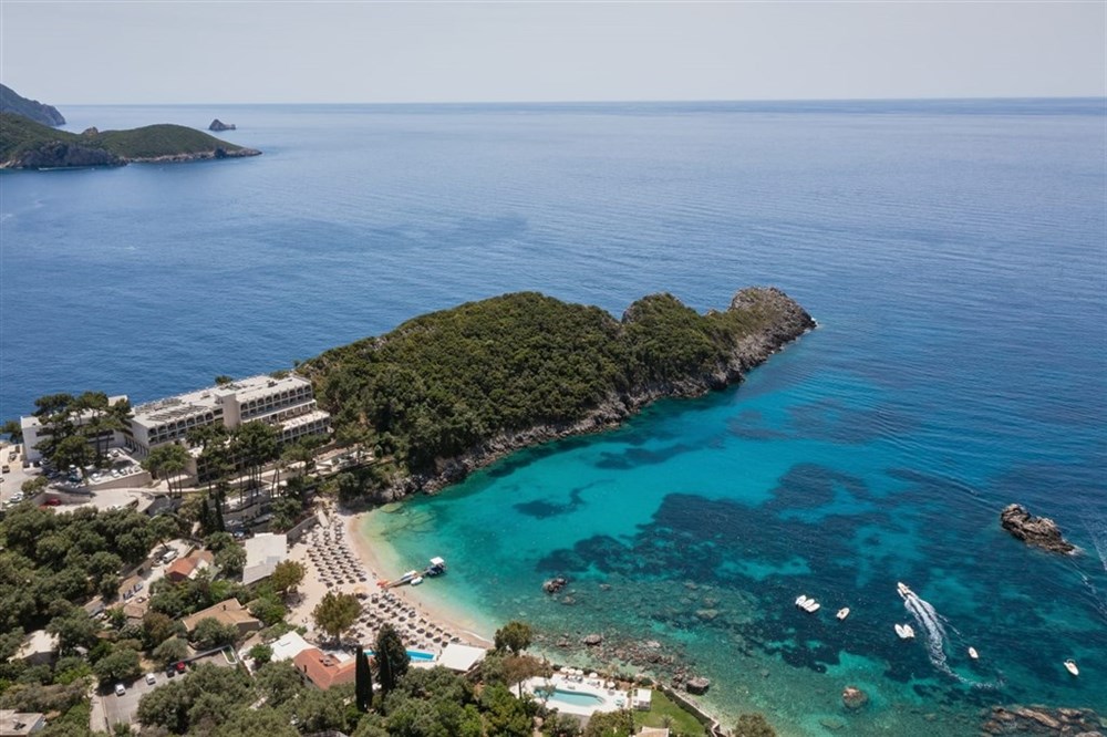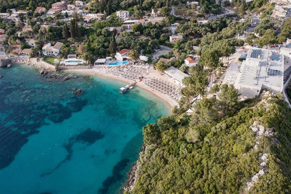 Hotel se nachází přímo u moře mezi dvěma plážemi v oblasti Paleokastritsa. Oblázková pláž Agia Triada je dostupná krátkou procházkou po schodech. Lehátka a slunečníky na pláži za poplatek, stejně jako nabídka vodních sportů.