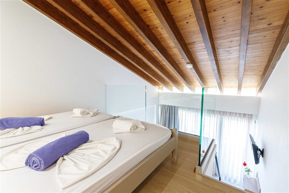Maisonette Beach Front (2-5 osob) – 40 m², mezonet 4 pevná lůžka – obývací pokoj s manželskou postelí a možností 1 přistýlky (pohovka), v patře ložnice s manželskou postelí, výhled na moře.