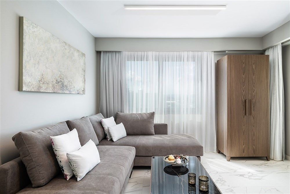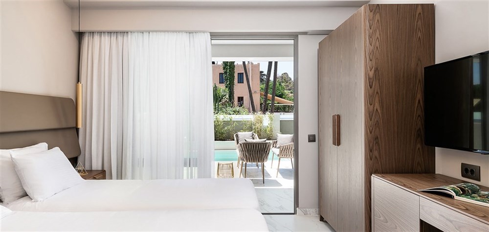 Serenity Suite Pool or Garden View (2-4 osoby) – prostorná ložnice se 2 samostatnými lůžky nebo jednou manželskou postelí a odděleným obývacím pokojem s rozkládací pohovkou.